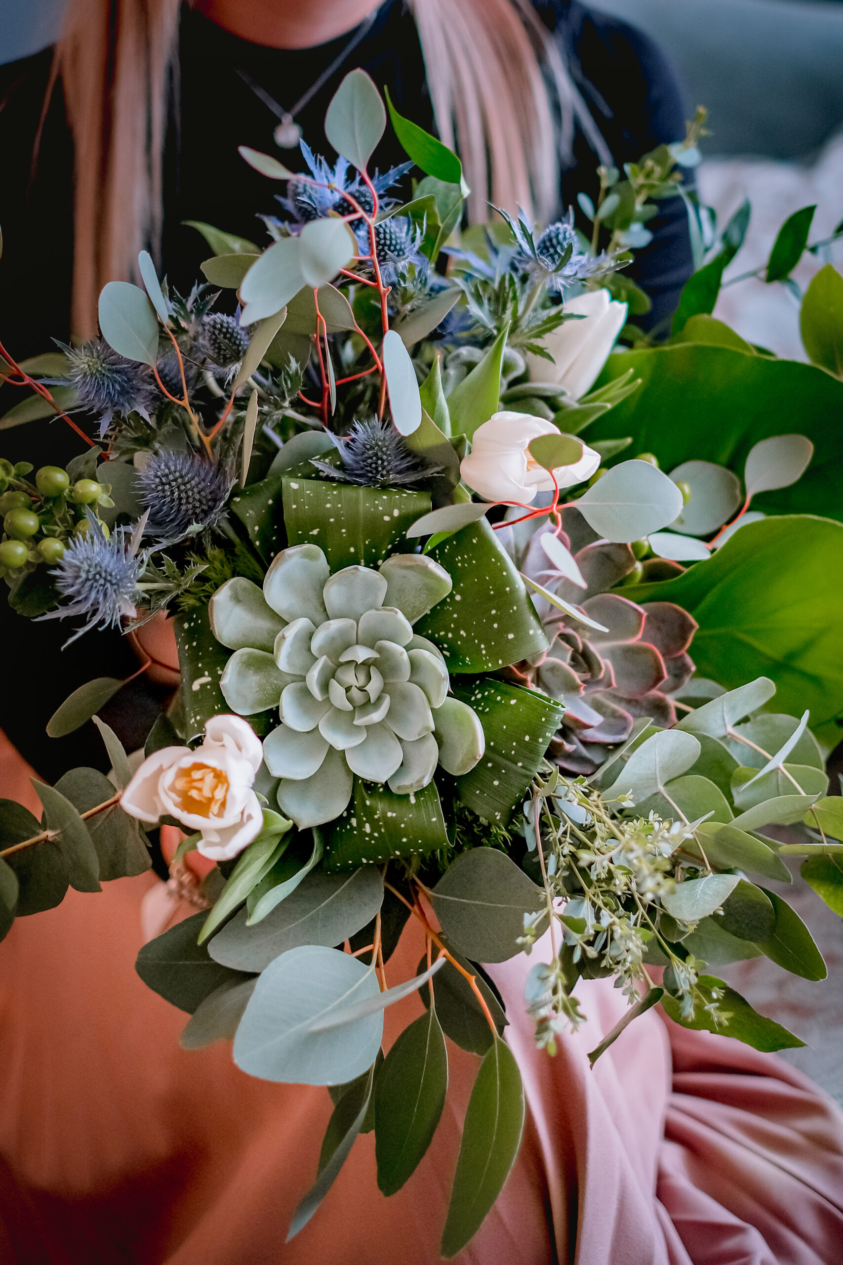 The bouquet consists of tulips, eryngium, hypericum berries, echeveria and greens.