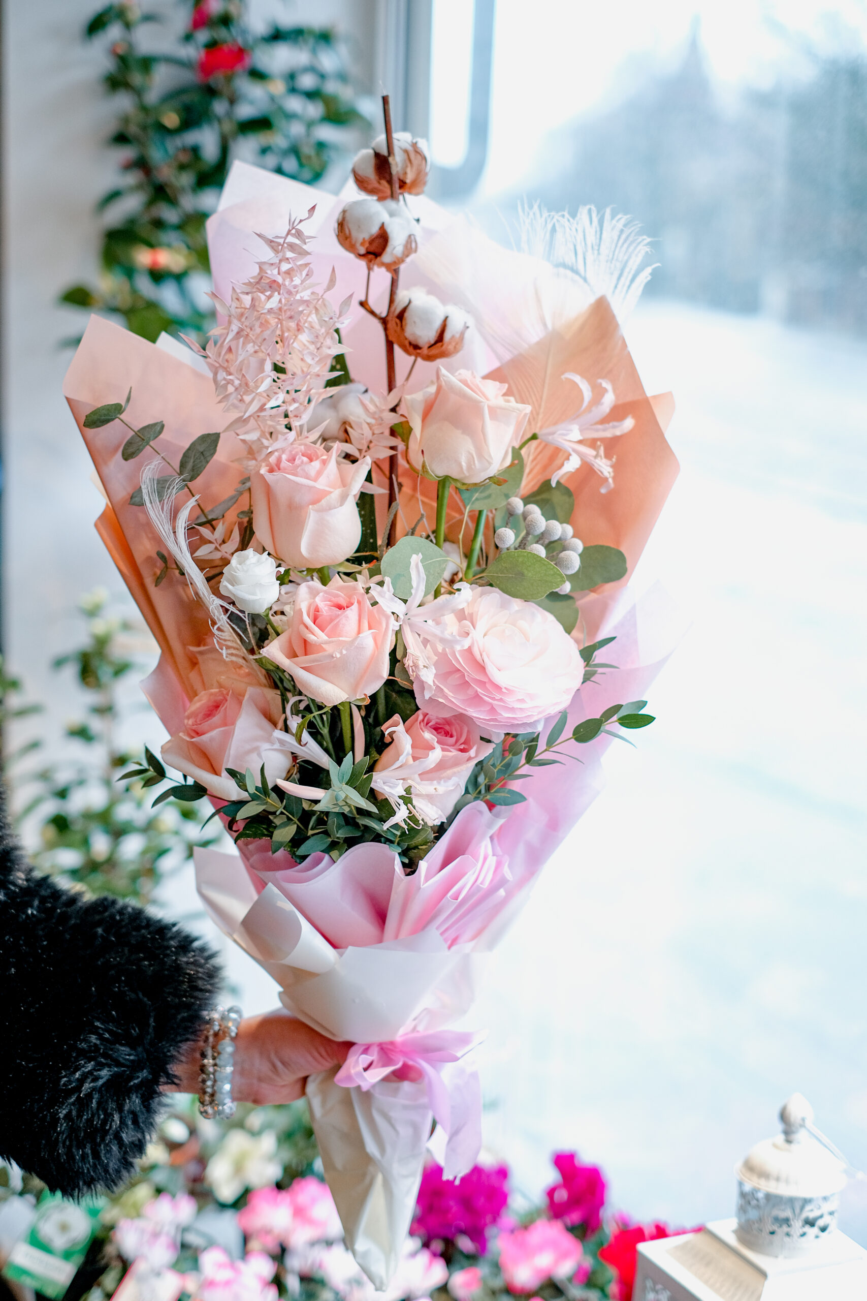 The flower bouquet consists of roses, ranunculus, decorative cotton, bleached ruscus branches, lisante, peacock feathers, brunia, greenery, wrapped in decorative paper.
