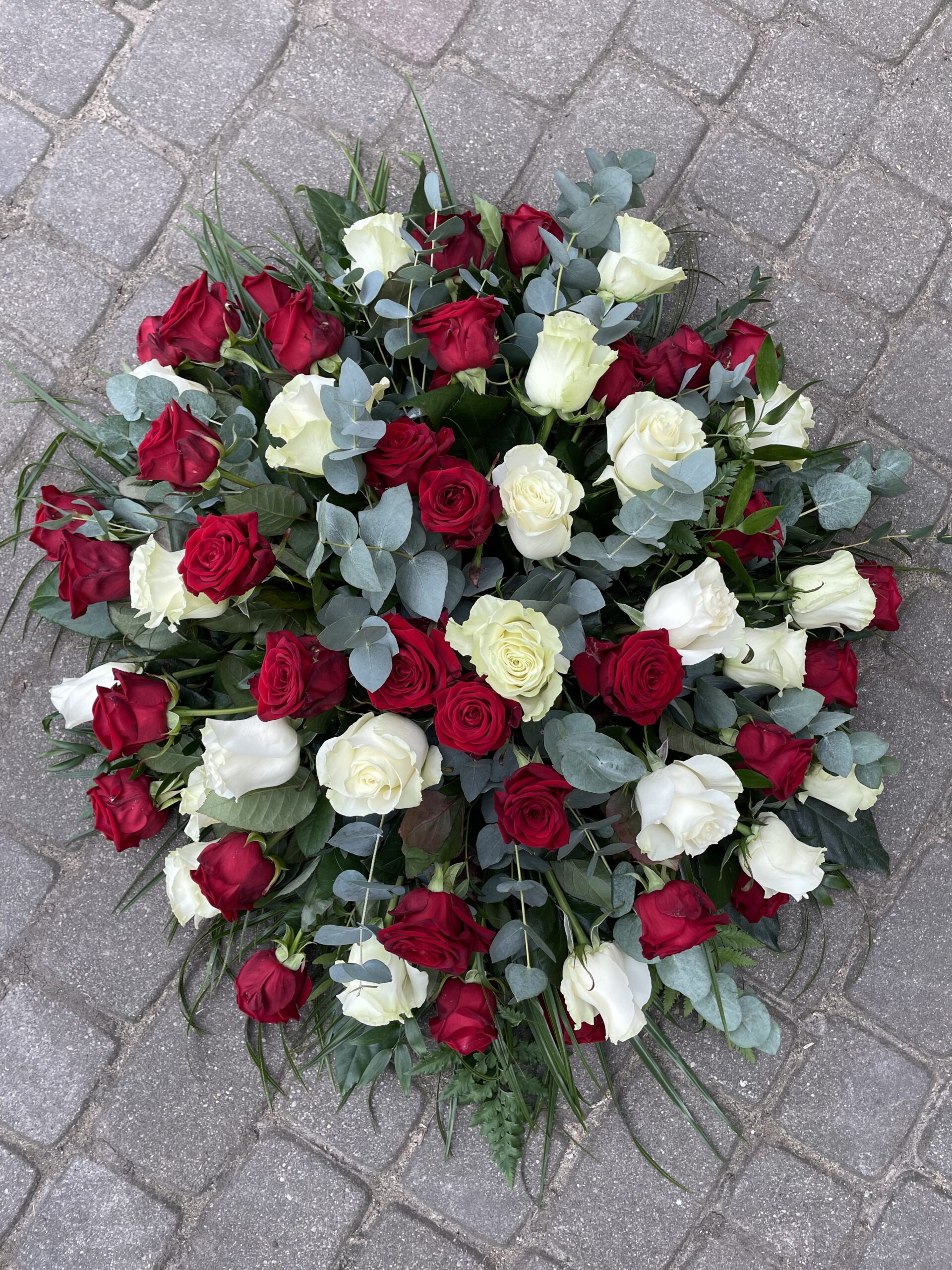 The wreath consists of roses and decorative greenery.